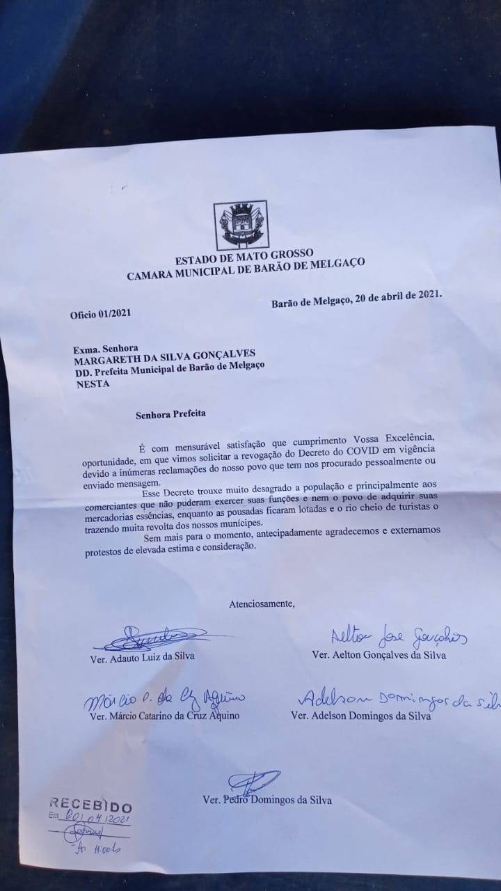 Cinco vereadores de Barão de Melgaço que compõe a base de apoio da prefeita Margareth Gonçalves (PSDB), assinaram um oficio e encaminharam a gestora nesta terça-feira (20), relatando o desagrado da população e os comerciantes do município com o decreto da prefeitura que proibiu o funcionamento normal do comércio durante os finais de semana, que passou a atender apenas pelo sistema Delivery.