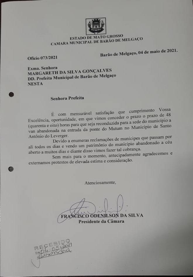 Atendendo reclamações dos munícipes, a Câmara Municipal de Barão de Melgaço-MT, notificou nesta terça-feira (04), a prefeitura do município, sobre uma Van da secretária municipal de Saúde, que estava abandonada na imediações da ponte do Rio Mutum, local onde funcionava até recentemente uma das Barreiras Sanitárias instaladas pela prefeitura para fiscalizar e combater o avanço do novo coronavírus no município.