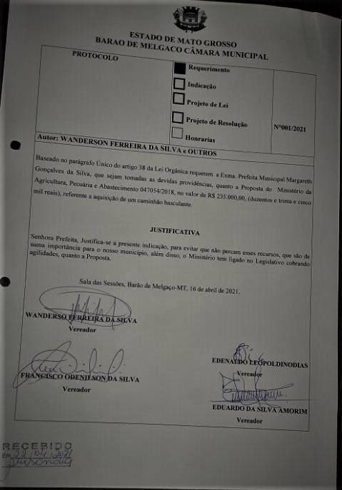 A aquisição do caminhão pela prefeitura era uma reivindicação dos vereadores, que recentemente encaminharam um pedido de providência à prefeita, haja visto que o convênio tinha prazo de validade para expirar. Diante disso, os vereadores que assinaram o requerimento justificaram a urgente necessidade da prefeitura em concretizar o processo de aquisição do utilitário.