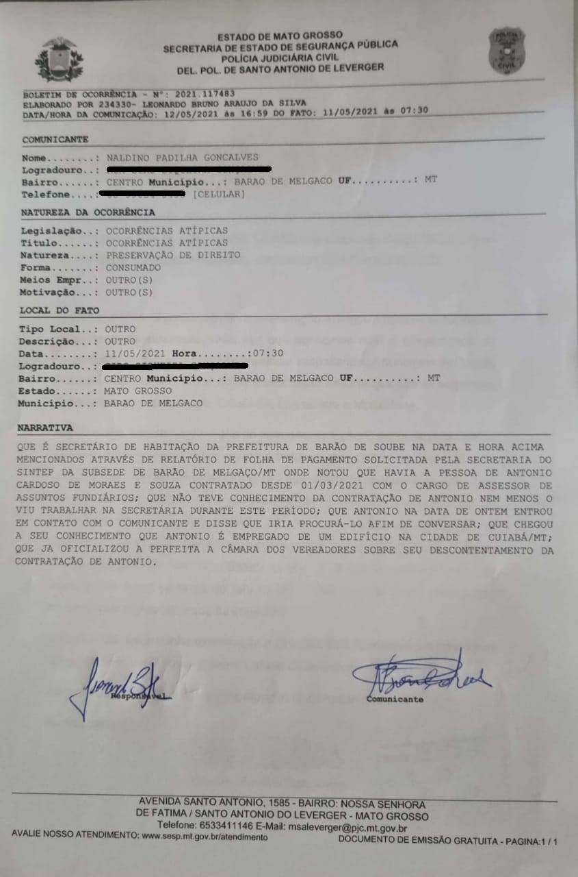 O então secretário de Habitação e Assuntos Fundiários de Barão de Melgaço, Naldino Padilha Gonçalves pediu exoneração do cargo alegando que a prefeita do município, Margareth Gonçalves da Silva (PSDB), contratou supostamente um servidor fantasma, que é o suplente de vereador Antonio Cardoso Moraes de Souza e logo após sua exoneração, tornou o suposto servidor como secretário da pasta.
