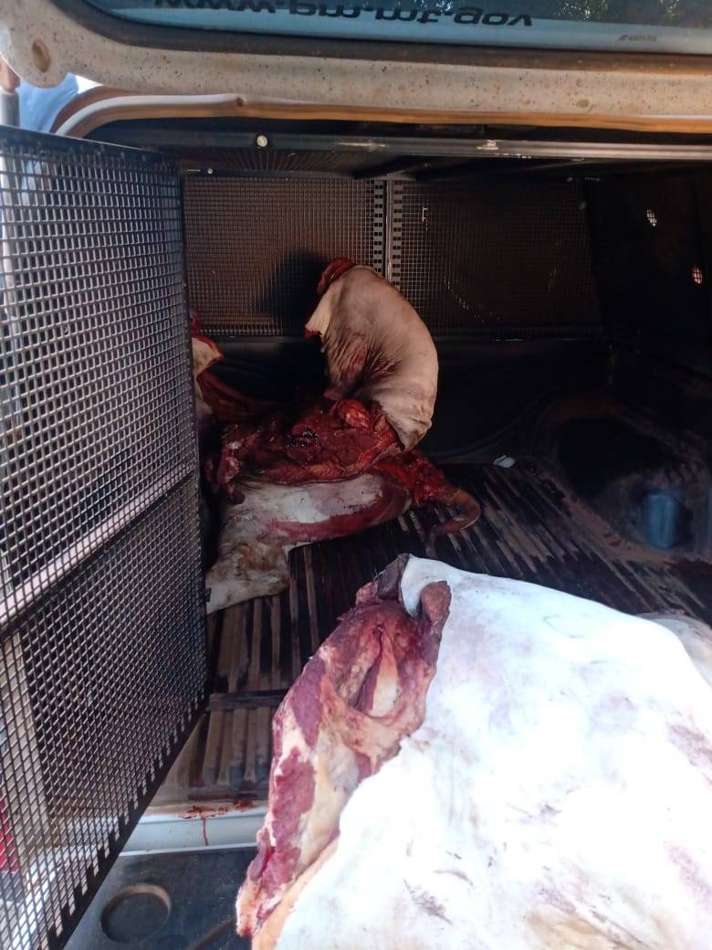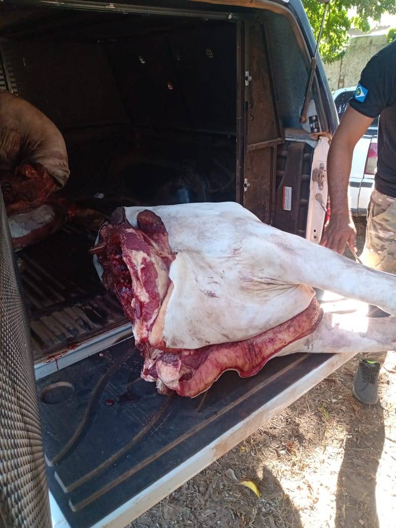 Uma guarnição com PMs da 3ª CIPM de Santo Antônio de Leverger, se deparou por volta das 5 horas da manhã deste sábado (05), com um veículo Corolla de cor preta, placa JZZ xxxx, parado na rodovia MT-361, próximo a comunidade da Gleba Resistência, e ao realizar a abordagem localizaram no interior do veículo e em seu porta-malas, uma grande quantidade de carne de ainda com couro.