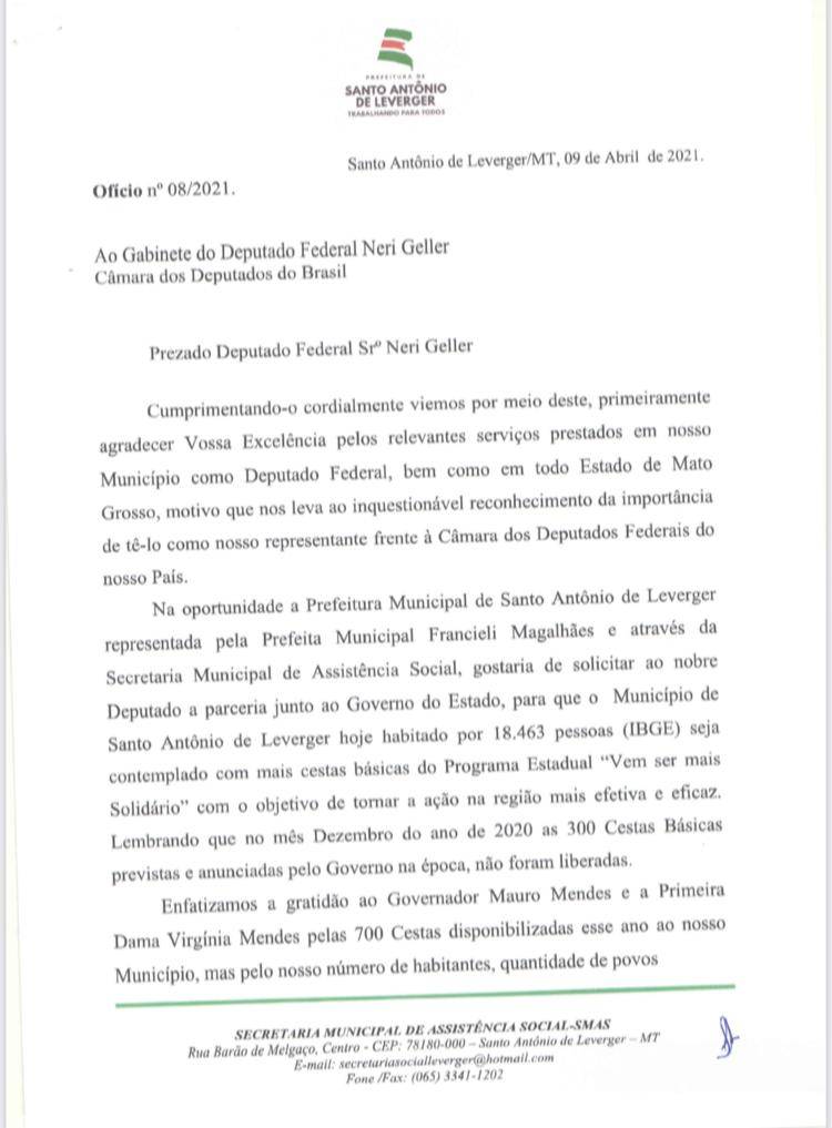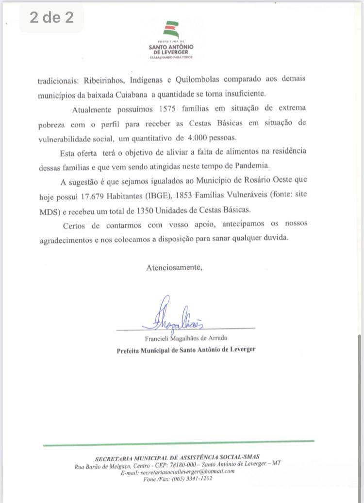 Diante da situação, a prefeita encaminhou um oficio ao deputado federal, Neri Geller (Progressista), solicitando a intermediação do parlamentar junto ao governo de Mato Grosso para que o município fosse novamente agraciado com cestas básicas.