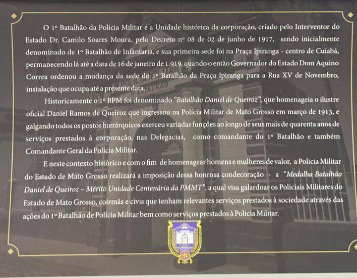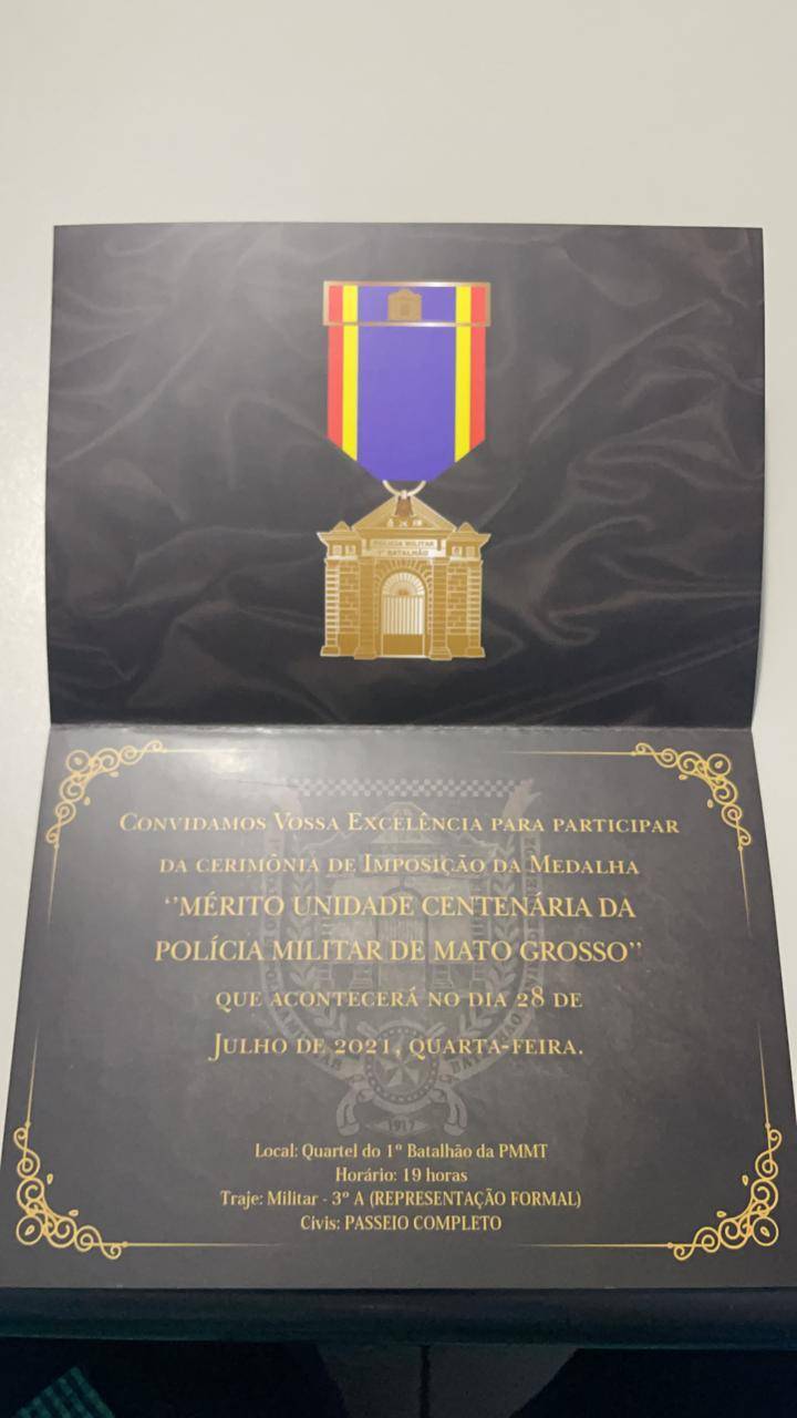 A solenidade será dia 28 de Julho, às 19:30hs na sede do Primeiro Batalhão de Polícia Militar do Estado de Mato Grosso.