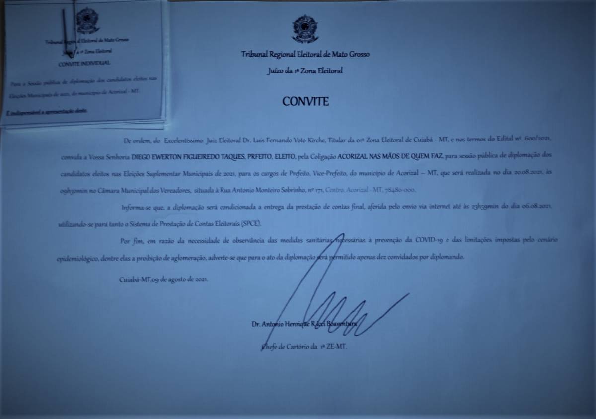 Vencedores na eleição suplementar de Acorizal-MT, Diego Taques como prefeito, e Bira como vice, serão diplomados pela justiça eleitoral de Mato Grosso, as 9 horas da próxima sexta-feira (20), no Cartório Eleitoral do município.