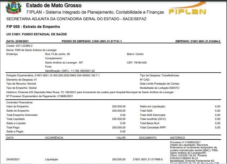 O valor destinado entrou na conta da prefeitura na última quinta-feira (21), e encontra-se depositado no Fundo Municipal de Saúde, conforme documento anexo nesta reportagem.