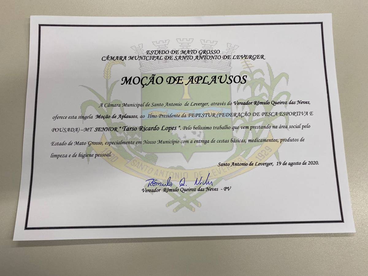O presidente da Câmara Municipal de Santo Antônio de Leverger, Rominho entregou na manhã desta terça-feira (09), uma Moção de Aplausos, ao empresário, Tarço Ricardo Lopes, por relevantes serviços prestados aos moradores do município, em especial da região de Mimoso (72 km da sede).
