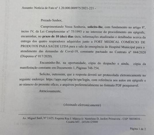 Segundo o documento, as investigações partiram após uma denúncia de um ex-vereador do município, O MPE busca informações detalhadas e atualizadas da entrega pela Fort Medical Comércio de Produtos para a Saúde Ltda, empresa que venceu a licitação e recebeu os valores da prefeitura.