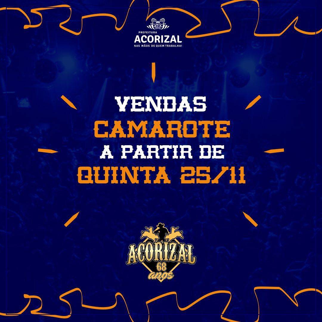 Os camarotes são espaços privilegiados para quem deseja aproveitar a festa com mais segurança e tranquilidade. As vendas dos camarotes para o Aniversário de 68 anos de Acorizal 2021, serão iniciadas a partir desta quinta-feira, dia 25 de novembro, a partir das 7h da manhã, na sala 03 da Prefeitura Municipal ou através do contato (65) 9 9685-6773 ou (65) 9 9668-7717.