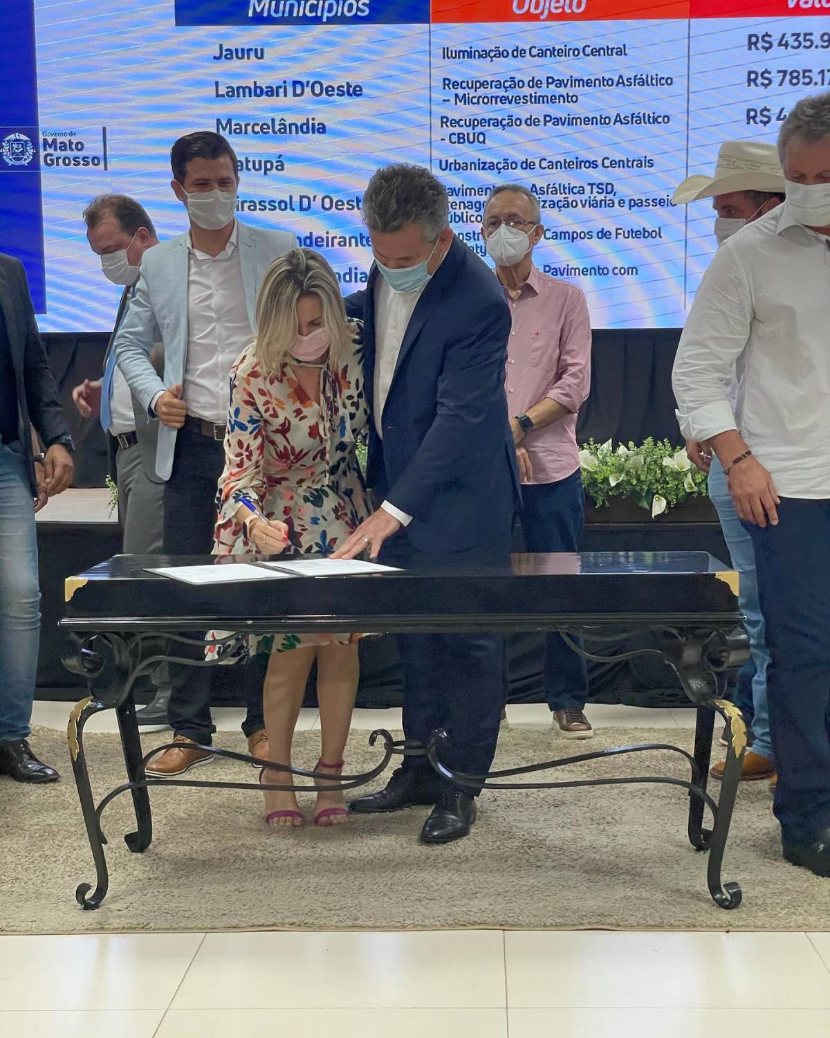 Durante a solenidade no Palácio Paiaguás, sede do Governo de Mato Grosso, a prefeita assinou junto com o governador, Mauro Mendes (DEM), um convênio que vai disponibilizar recursos financeiros para que a prefeitura possa revitalizar com um micro revestimento, a Avenida Brasil e as ruas Cuiabá e Juari Benedito de Campos. As vias também receberão novas sinalizações vertical e horizontal.