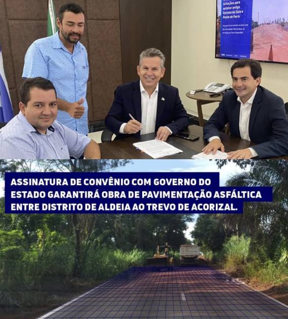 O Prefeito Diego Taques e Vice-prefeito Bira assinaram junto ao Governador Mauro Mendes e o Senador Fabio Garcia convênio de aproximadamente 3 milhões e novecentos mil para obra de pavimentação asfáltica no trecho que liga o Distrito de Aldeia ao trevo na entrada do município.
