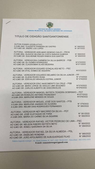 Em comemoração pelos 122 anos de emancipação político-administrativa do município de Santo Antônio de Leverger-MT, a câmara municipal realizou na manhã desta segunda-feira (13), uma sessão solene, presidida pelo chefe do Poder Legislativo Municipal, vereador Rômulo Queiroz (PV), contou com a participação de todos os membros da Mesa Diretora e demais vereadores. Na mesma sessão, os vereadores entregaram 23 títulos honoríficos de cidadãos santo-antonienses.