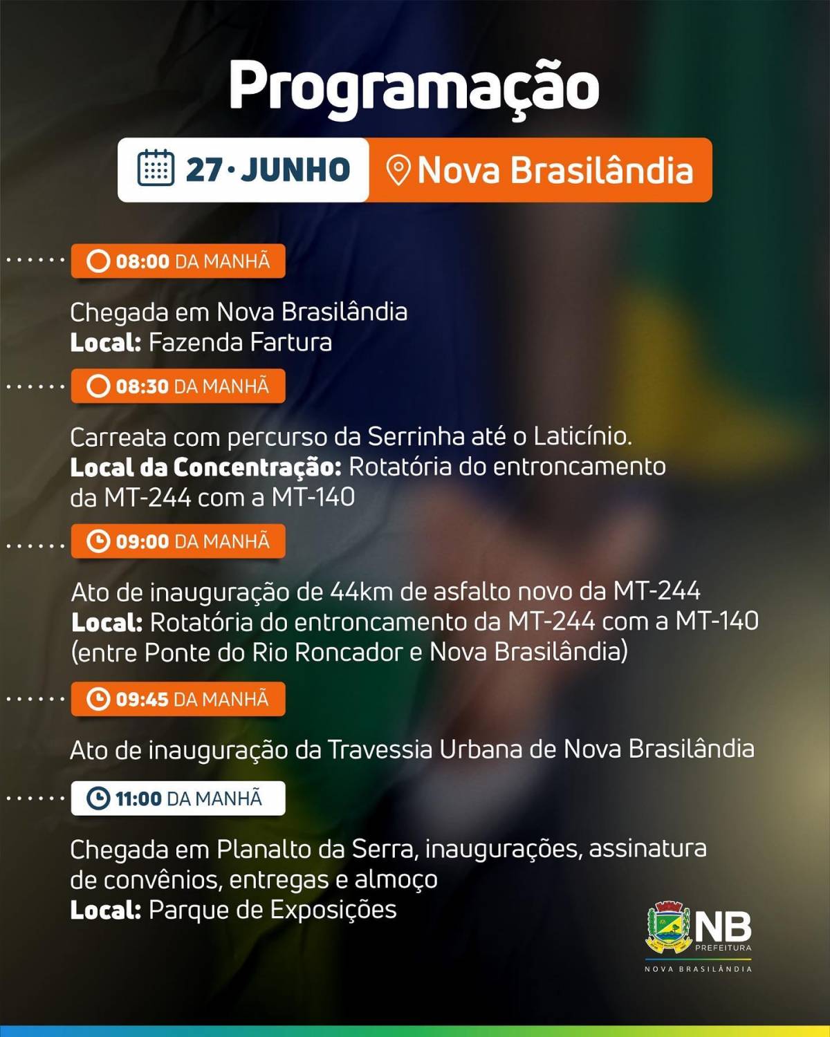 O governador chega em Nova Brasilândia no período da manhã e às 09h vai inaugurar a revitalização de 60 km da MT-244, realizado em parceria com a Prefeitura de Campo Verde, e o asfaltamento de outros 30,8 km da mesma rodovia, em parceria com a Associação Agrologística. Juntas, as duas obras representam um investimento de 17,1 milhões.