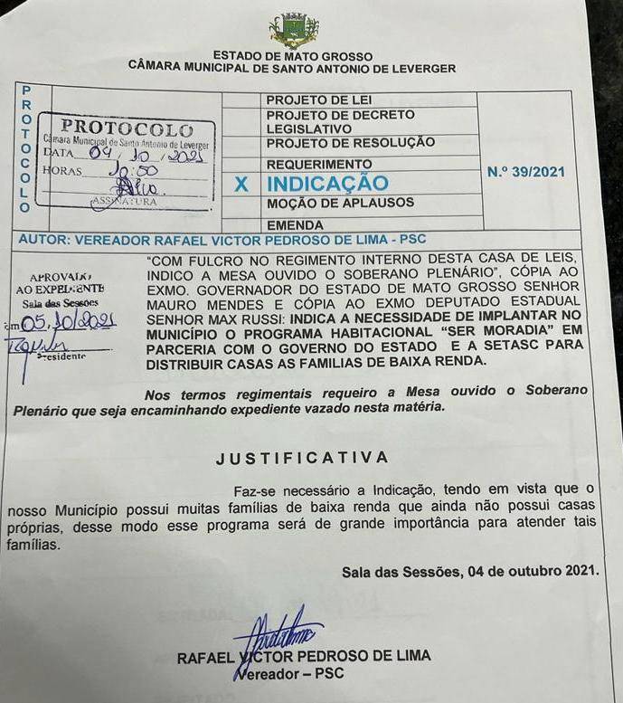 Sabendo da notícia da possibilidade da implementação do programa habitacional, em 04 de outubro de 2021, o vereador Rafael Lima protocolou na Câmara Municipal indicação requerendo ao deputado Max Russi (então presidente da Assembleia Legislativa de Mato Grosso) e o governador Mauro Mendes (União Brasil) a construção das moradias em Santo Antônio de Leverger.