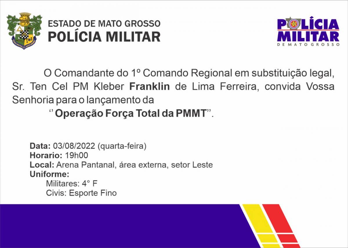 A Polícia Militar de Mato Grosso deflagra nesta quarta-feira (03.08) a Operação Força Total, em todos os municípios do Estado. A solenidade de lançamento ocorre a partir das 19h, na Arena Pantanal, em Cuiabá.