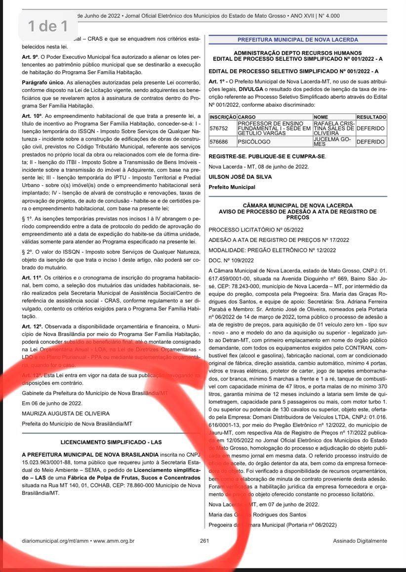 Segundo uma publicação do Jornal Oficial Eletrônico dos Municípios do Estado de Mato Grosso, com data de 10/06/2022, a prefeitura municipal através da Secretaria Municipal de Agricultura, tornou público e requereu junto a Secretaria Estadual de Meio Ambiente – SEMA, o pedido de Licenciamento simplificado – LAS de uma Fábrica de Polpa de Frutas, Sucos e Concentrados situada na Rua MT 140, 01, COHAB, CEP: 78.860-000 Município de Nova Brasilândia/MT.