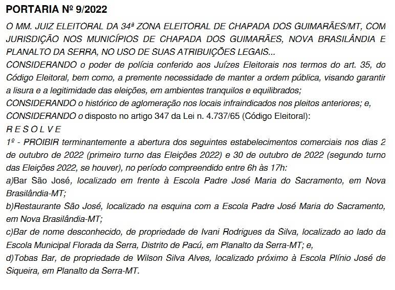 O juiz Leonísio Salles de Abreu Júnior, da 34ª Zona Eleitoral, determinou o fechamento de bares e restaurantes nos municípios de Nova Brasilândia e Planalto da Serra, entre 6h e 17h de domingo das eleições (02.10). A proibição também foi estabelecida no dia 30 de outubro (data do segundo turno das eleições).
