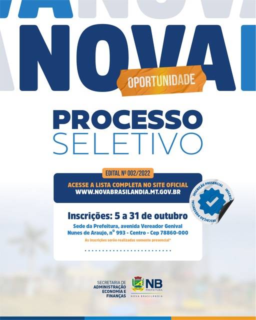 Os interessados podem efetuar inscrições, de forma presencial, na sede da Prefeitura Municipal de Nova Brasilândia, localizada na avenida Vereador Genival Nunes Araujo, Nº 993, Centro. O prazo de inscrição se encerra no dia 31 de outubro. Não será cobrada taxa de inscrição.