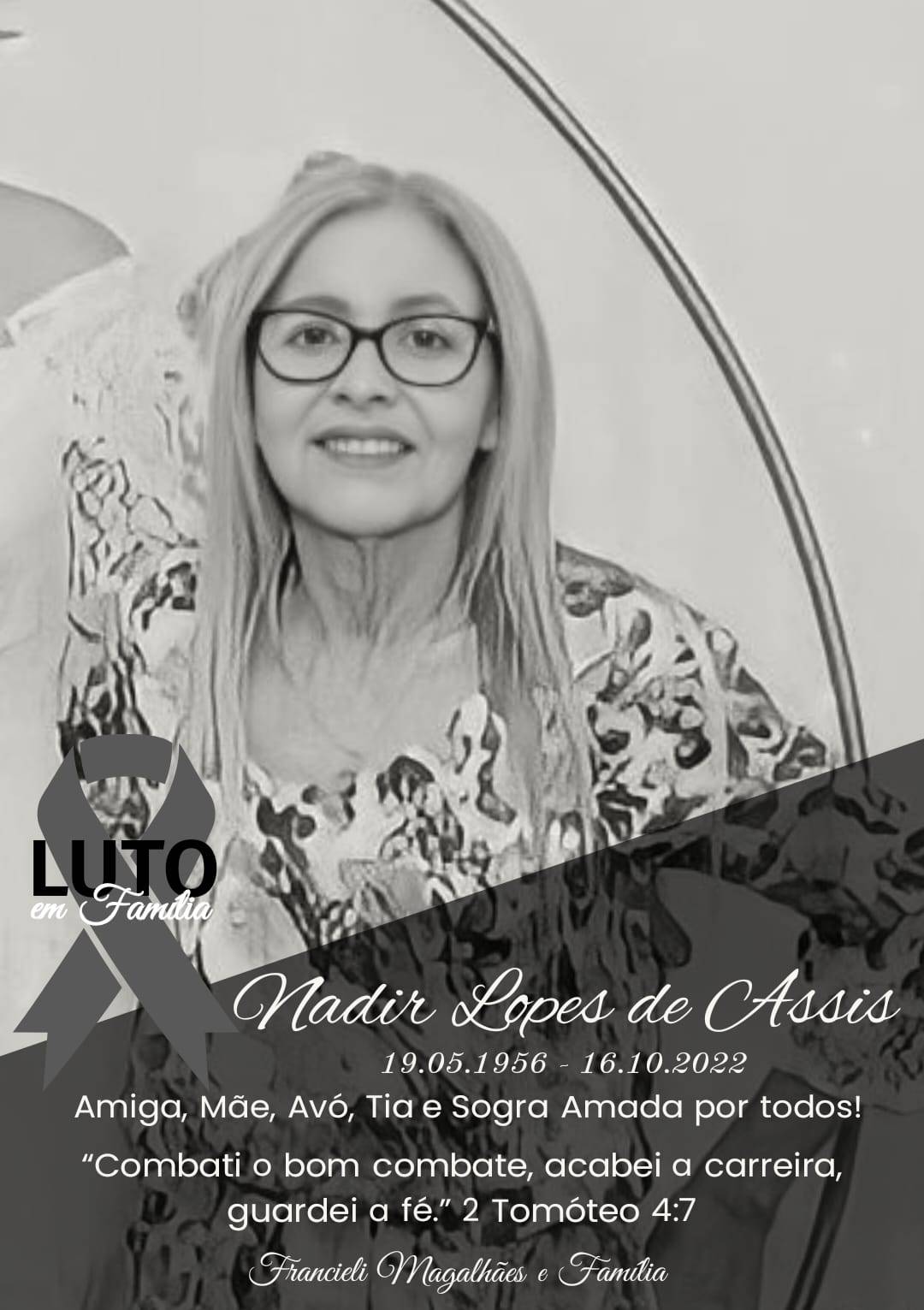 Com muita tristeza e profundo pesar que recebemos a notícia do falecimento da senhora Nadir Lopes de Assis, mãe do nosso amigo irmão e secretário de governo, Izaias Júnior, sogra da nossa prefeita Franciele Magalhães... Em nome da câmara municipal manifesto aqui os sentimentos de pesar, rogando sempre a Deus que possa confortar a todos os familiares e amigos neste momento de dor, descansa em paz dona Nadir.