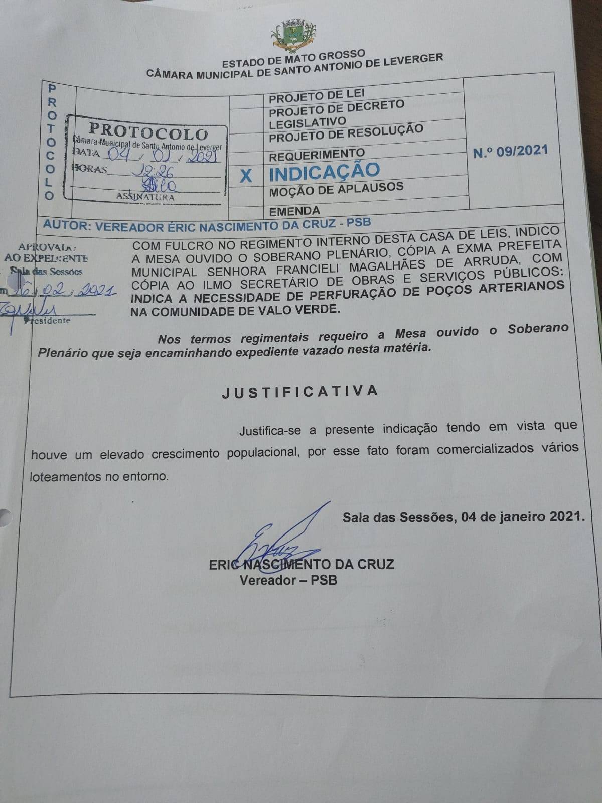 A perfuração do poço foi a primeira indicação do vereador assim que assumiu o mandato em janeiro de 2021. “Justifica-se que houve um elevado crescimento populacional, por esse fato foram comercializados vários loteamentos no entorno”, diz trecho extraído da justificativa ao apresentar a indicação à prefeita Franciele Magalhães.