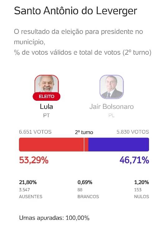 O presidente eleito Luiz Inácio Lula da Silva venceu em apenas 18 municípios mato-grossenses nesse segundo turno. São municípios pequenos, com baixas populações e baixa dinâmica econômica, como as cidades do Pantanal Norte Poconé, Livramento, Santo Antonio e Barão de Melgaço, ou regiões estagnadas, que concentram grandes populações pobres, como Alto Paraguai e Porto Estrela.