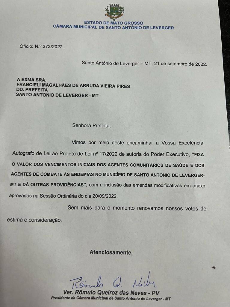 No mês de setembro, a prefeita de Santo Antônio de Leverger, Francieli Magalhães, publicou decreto regulamentando o pagamento do novo valor do piso aos agentes comunitários de Saúde e aos agentes de combate a endemias.