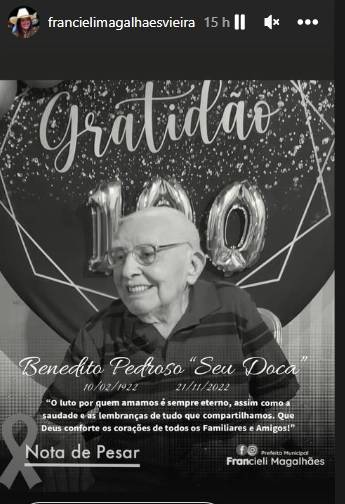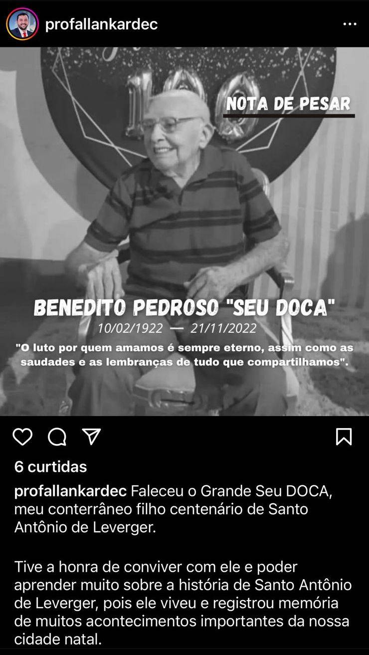 A prefeita Francieli Magalhães (PTB), e o presidente da câmara municipal de Santo Antônio de Leverger-MT, vereador Rômulo Queiroz das Neves, emitiram nesta terça-feira (22), Nota de Pesar pelo falecimento do ilustre morador da cidade, Benedito Pedroso, “ Seu Doca”, que faleceu na noite desta segunda-feira (21), num hospital particular em Cuiabá onde estava internado numa UTI em decorrência de problemas de saúde.
