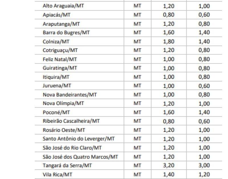 Água Boa; Arenápolis; Aripuanã; Campo Novo do Parecis; Canarana; Juara; Juína; Lucas do Rio Verde; Nobres; Nova Canaã do Norte; Nova Mutum; Nova Xavantina; Paranatinga; Pontes e Lacerda; Poxorél; Primavera do Leste; Querência; Sinop; Sorriso; Tabaporã; Terra Nova do Norte; Vila Bela da Santíssima Trindade. (Com Assessoria)