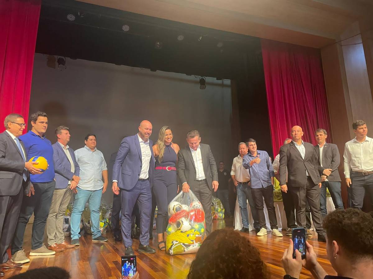 O governador entregou kits esportivos aos representantes municipais, contendo bolas de futebol, futsal, vôlei, basquete e handebol, e, ainda, com coletes, redes, cronômetro e outros materiais.