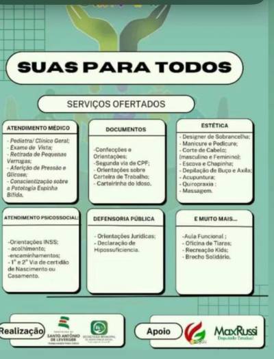 Ainda segundo a ela, terá outro evento neste sábado (11.03), denominado “SUAS Para Todos”, a ser realizado das 08 horas até às 12 horas, na Escola Estadual Leônidas de Mattos, onde serão ofertados mais de 30 serviços totalmente gratuito a população, entre eles: corte de cabelo, atendimentos médicos, em pediatria, exame de vista, realização de pequenas cirurgias, aferição de pressão e glicose, conscientização sobre patologia espinha bífida. O evento ocorreu em parceria com o deputado estadual, Max Russi (PSB).