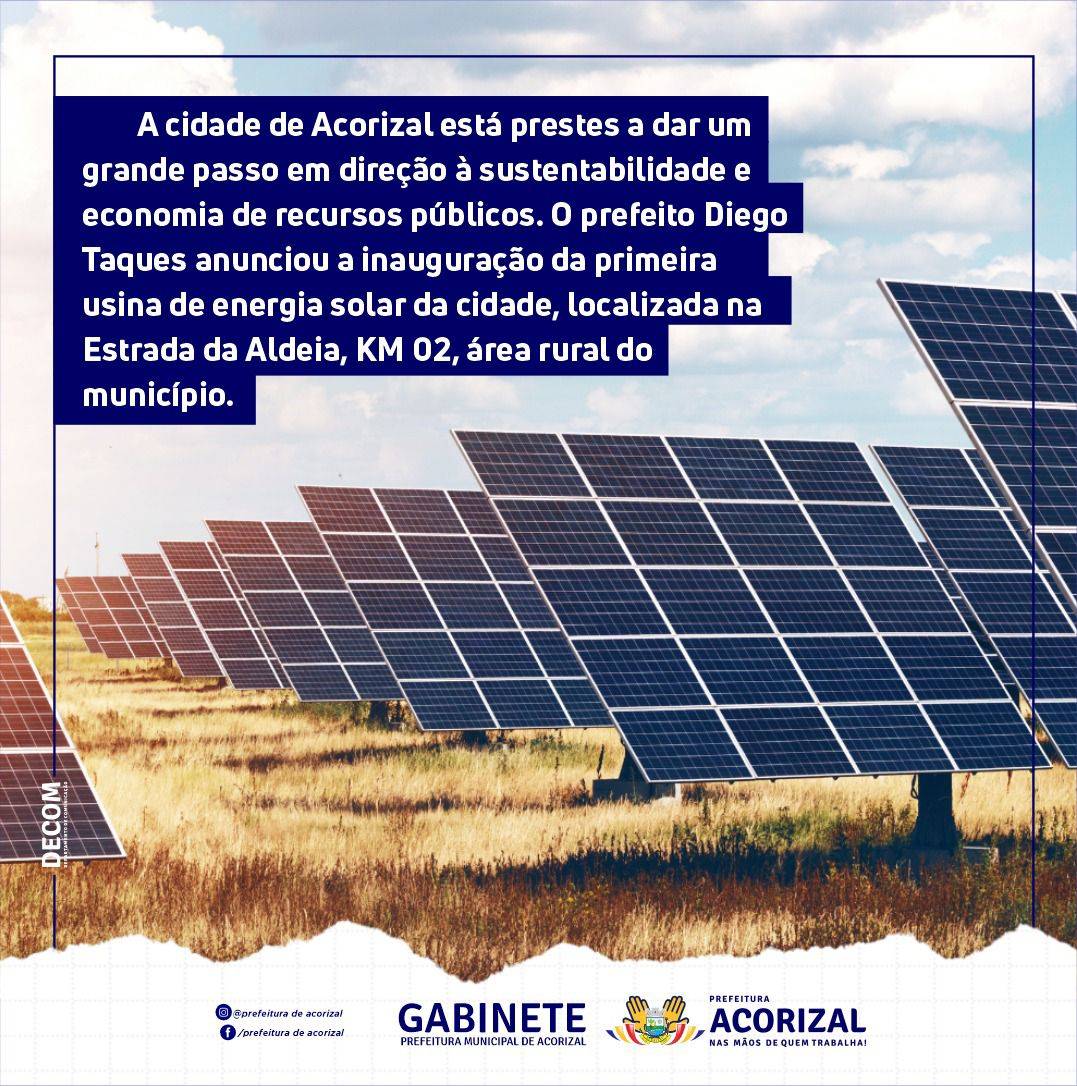 A cidade de Acorizal está prestes a dar um grande passo em direção à sustentabilidade e economia de recursos públicos. O prefeito Diego Taques anunciou a inauguração da primeira usina de energia solar da cidade, localizada na Estrada da Aldeia, KM 02, área rural do município.