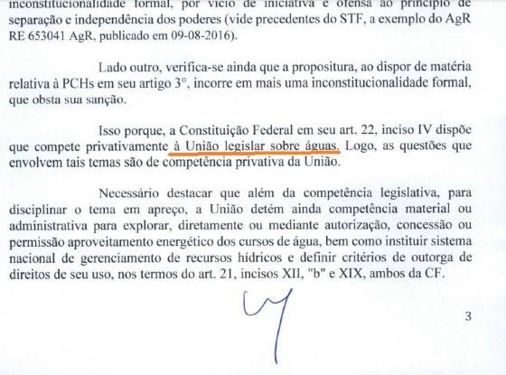 A mensagem de Mauro formalizando os vetos à mesa-diretora foi encaminhada em 4 de julho e lida em plenário em 2 de agosto. A justificativa do governador é que cabe "a União legislar sobre sobre as águas". Mendes também citou decisão do Supremo que pontua que é de competência da Agência Nacional das Águas (ANA) em conjunto com o Operador Nacional do Sistema Elétrico (ONS) a decisão sobre PCHs.