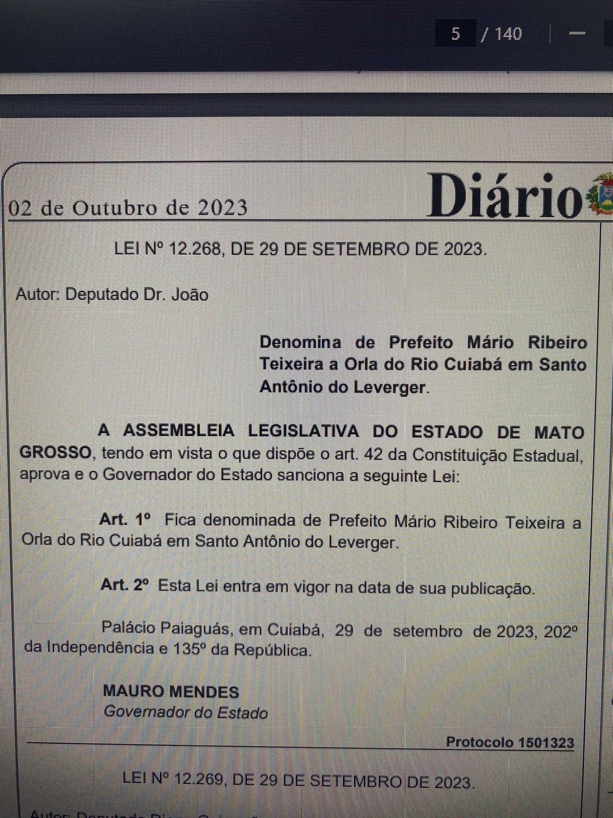 O governador Mauro Mendes (UB) sancionou e o Diário Oficial do estado de Mato Grosso publicou nesta segunda-feira (02) a Lei Nº 12.268, que atribui o nome do ex-prefeito Mário Ribeiro à Orla de Santo Antônio, atualmente em construção pelo governo estadual e programada para inauguração em 2024.