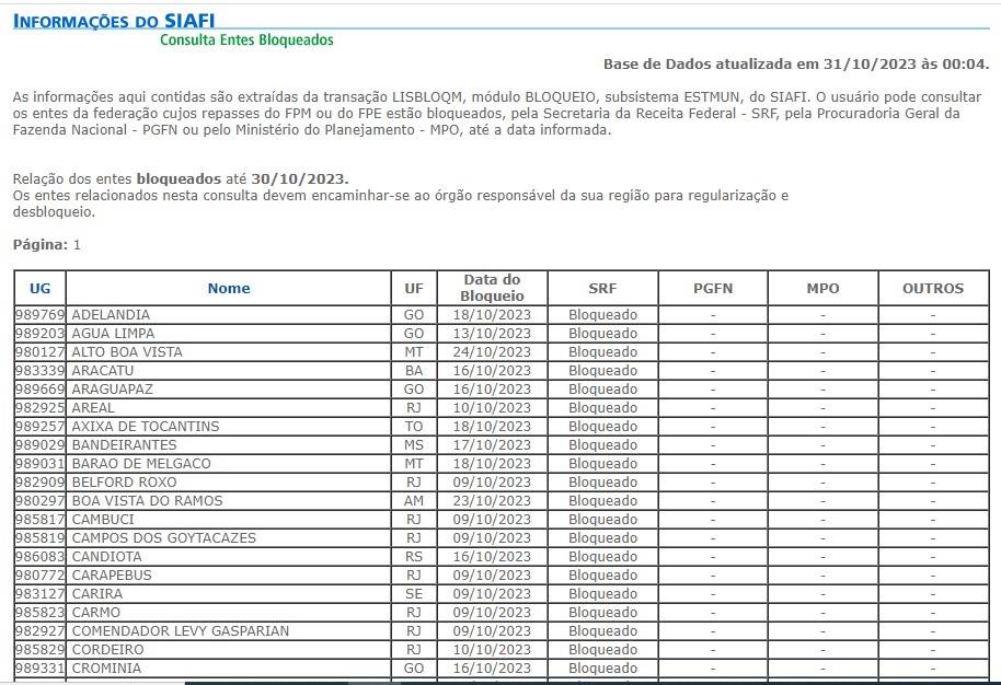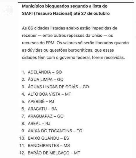 Municípios bloqueados segundo a lista do SIAFI (Tesouro Nacional)