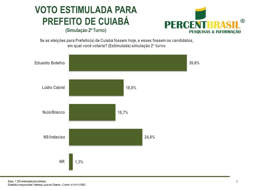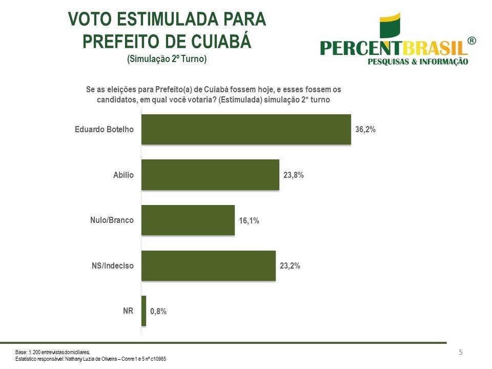 Já no cenário contra o deputado Abílio Brunini (PL), Botelho alcançou novamente a liderança das intenções de votos com 36,2%, enquanto o adversário 23,8% do favoritismo. Já 16,1% disseram que votariam branco/nulo em caso de eventual disputa de 2º entre os dois, e 23,2% responderam estar indecisos.