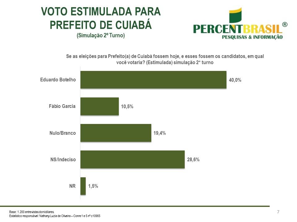 No cenário contra o deputado federal, Fábio Garcia (UB), que é do mesmo grupo político de Botelho, o líder da AL também saiu na frente, conforme a pesquisa, com 40% das intenções de votos. Garcia, por sua vez, teve 10,5% da preferência. 19,4% dos moradores de Cuiabá votariam nulo ou branco, enquanto 28,6% não souberam responder.