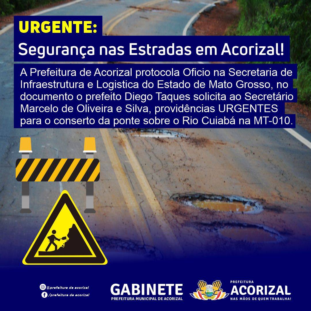 O prefeito de Acorizal, Diego Taques, protocolou nesta segunda-feira (15) na Secretaria de Infraestrutura e Logística do Estado de Mato Grosso um ofício solicitando providências urgentes para o conserto da ponte sobre o Rio Cuiabá na MT-010. O documento alerta para as cabeceiras danificadas e o acúmulo de água, representando riscos significativos para motoristas e passageiros que utilizam a via. Além disso, ressalta a urgência no reparo das cabeceiras das pontes sobre os rios Acorizal e Baús, igualmente comprometidas.