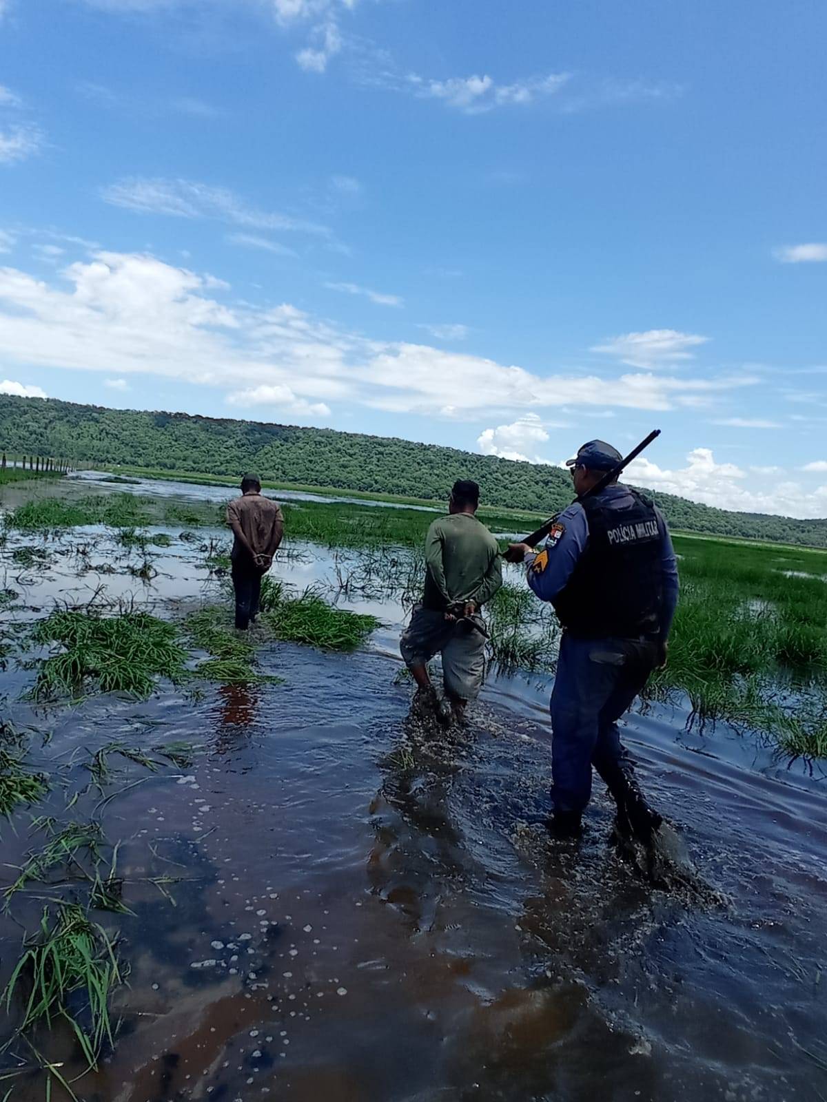 Devido ao acesso complicado dentro da Baía Chacororé, os suspeitos foram conduzidos a pé pela baía até o local onde a viatura estava posicionada. Em seguida, foram encaminhados à Delegacia de Polícia Civil de Santo Antônio do Leverger para as providências necessárias. Os suspeitos foram entregues sem lesões corporais, e o uso de algemas foi necessário devido ao risco de fuga. Registra-se a natureza da ocorrência como ameaça em desfavor do senhor Antenor, contratante dos suspeitos.