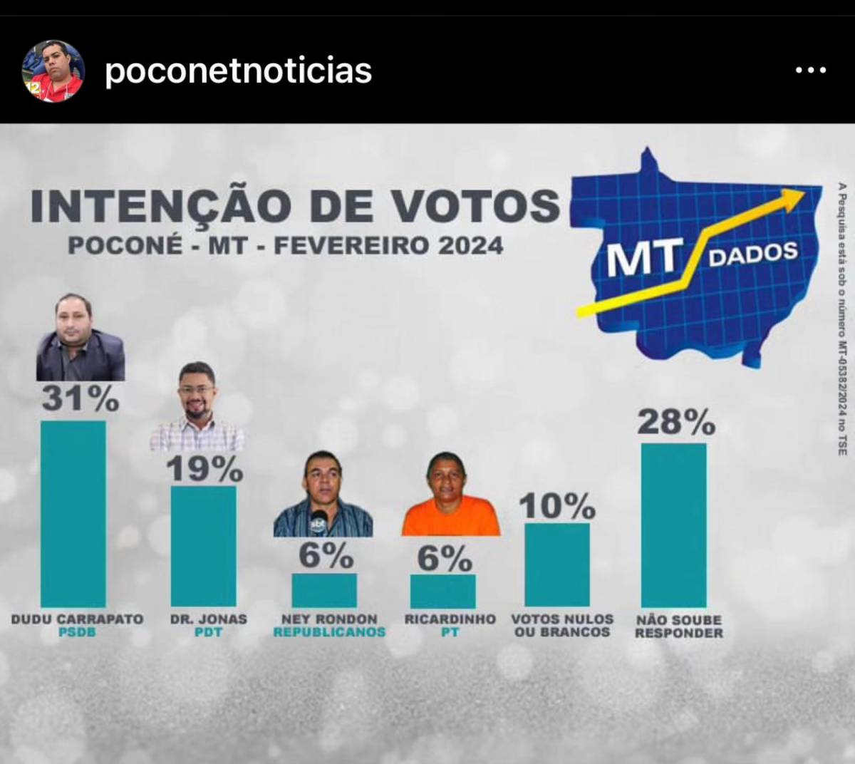 O vereador de Poconé (100 Km de Cuiabá), Luis Eduardo Almeida de Aquino Nunes, o “Dudu Carrapato” (PSDB), lidera com folga as pesquisas de intenção de voto para a prefeitura do município em 2024. Segundo o instituto MT Dados, Dudu Carrapato lidera em todos cenários chegando a 31% na simulação de confronto com outros adversários.