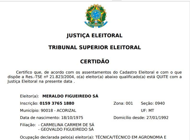 O Tribunal Superior Eleitoral (TSE) liberou na terça-feira a quitação eleitoral do ex-prefeito de Acorizal, Meraldo Sá (PSD). Com a decisão, ele está apto a concorrer na eleição deste ano em outubro, caso decida dessa forma.